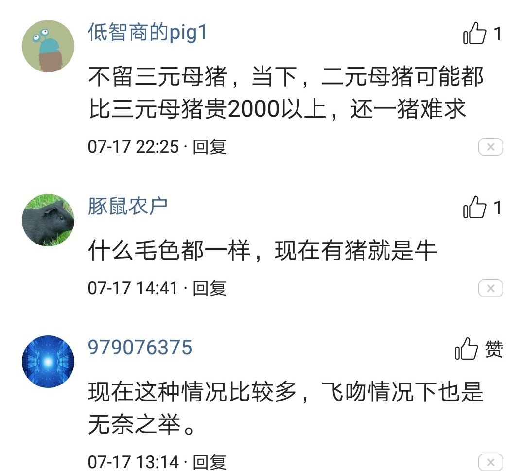 不少養戶在網絡上討論三元母豬留種