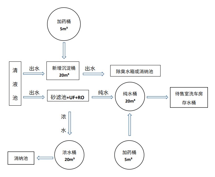 5. 反滲透出水口(純水和濃水)增加蓄水桶(20m3),材質PE,要求配置強排泵和凈水池消毒投加設備,排泥管道接入甲方現有的污泥濃縮池。